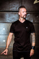 Ich bin ein klassisches, gerade geschnittenes, schwarzes T-Shirt mit V-Ausschnitt aus mittelschwerem, super weichem und strapazierfähigem Stoff.